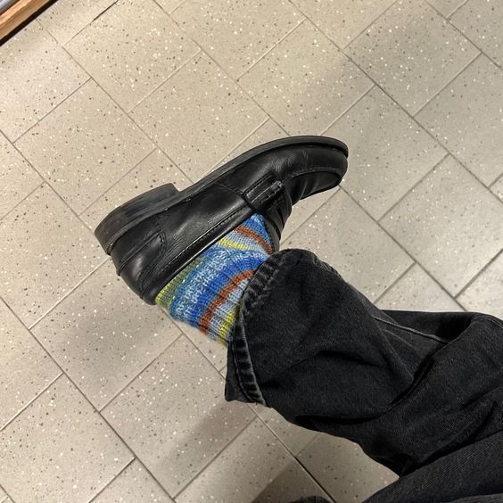 En kul styling jeg vil gjøre selv spesielt i boots, loafers og andre sko (gjerne skinn) er strikkesokkene du har fått av bestemor. Sånn som dette: