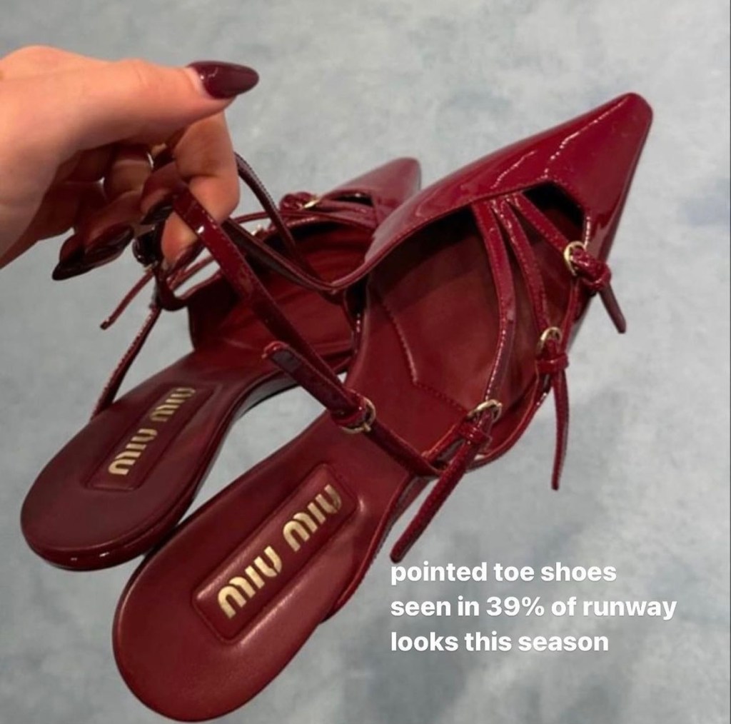 Vi fortsette å se den runde formen som ballerina flats i 2024 (heldigvis fordi I love!!) Men blant hæler så er det de avrunde hælene som har vært de mest mainstream hælene de siste årene, men det siste året og for SS24 har vi sett blant annet Miu Miu og Prada aka MOTHER Miuccia Prada har gitt pointy toe heels (gjerne kitten heels også) liv igjen. Spesielt med sokker eller farget tights !!! Døds fett! Ganni sine Buckle Ballerinas med pointy toe har jo vært ekstremt populære siste året, som garantert har ført til folks sans for spisse hæler som fin sko, inkludert meg. Synes faktisk forskjellen på en fashionista er hvilke type hæler man bruker, riktig = pointy heels.