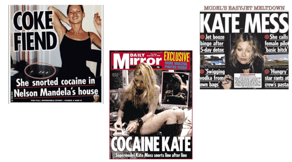 Kate Moss og de andre supermodellene var ikke ukjent for å ruse seg i bransjen. Hun har innrømmet at hun alltid hadde champagne før showene, uansett om det var klokken 10 på morningen. Og hun har vært på rehab i 1998 for «utmattelse,» men det er ikke utenkelig at det kan være for et rusproblem. Alt var bare gossip, ingenting var bevist helt til…. 2005 da det blir spredd en video av henne som tar flere linjer kokain, og det havnet på forsiden av «DailyMirror.»